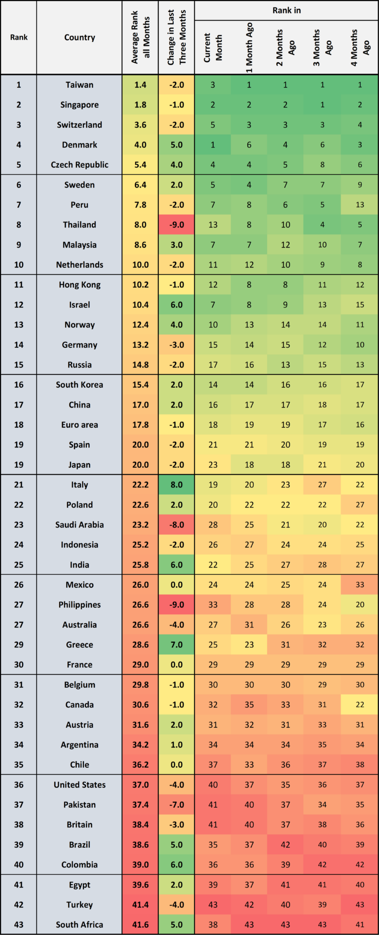 Singapore, Taiwan, the Czech Republic as well as Sweden and Switzerland complete the top-5.