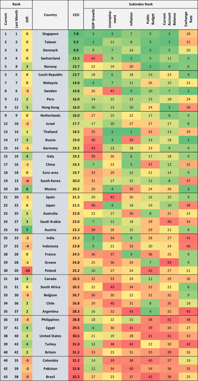 All six components are weighted equally, reflecting the fact that there are trade-offs. Expansionary fiscal and monetary policy, for instance, can lower unemployment and foster GDP growth but can come at the price of higher inflation and a larger public deficit.For the calculation of the CED index, the average rank across all six macroeconomic subindices is computed.
